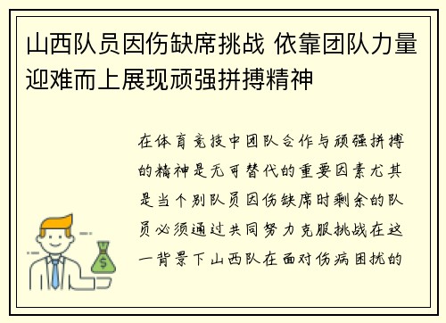 在体育竞技中,团队合作与顽强拼搏的精神是无可替代的重要因素。尤其是当个别队员因伤缺席时,剩余的队员必须通过共同努力克服挑战。在这一背景下,山西队在面对伤病困扰的情况下展现了非凡的团队力量,凭借顽强的拼搏精神迎难而上,完成了对挑战的有效回应。...
