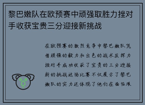 在欧预赛的激烈竞争中,黎巴嫩队凭借顽强的毅力和出色的战术发挥,力挫对手,成功收获了宝贵的三分,迎接新的挑战。这场比赛不仅展示了黎巴嫩队的实力,还体现了他们在面临艰难局面时的坚韧不拔和不屈不挠的精神。本文将从四个方面进行详细阐述:一是黎巴嫩队...