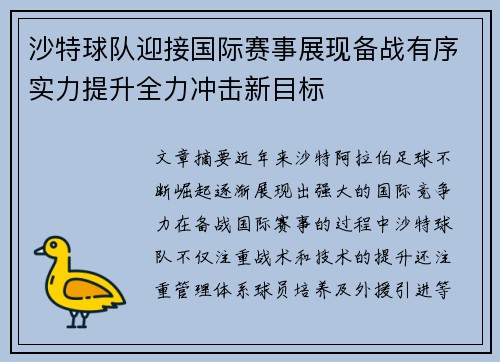 文章摘要:近年来,沙特阿拉伯足球不断崛起,逐渐展现出强大的国际竞争力。在备战国际赛事的过程中,沙特球队不仅注重战术和技术的提升,还注重管理体系、球员培养及外援引进等方面的完善。通过这些多方面的努力,沙特球队展现了备战的有序性和实力的提升。在...