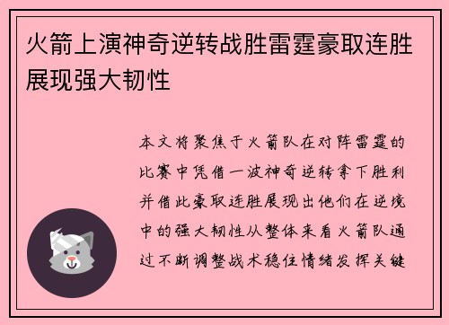 本文将聚焦于火箭队在对阵雷霆的比赛中,凭借一波神奇逆转拿下胜利,并借此豪取连胜,展现出他们在逆境中的强大韧性。从整体来看,火箭队通过不断调整战术、稳住情绪、发挥关键球员的作用以及全队的默契配合,成功从比分落后的局面逆袭而上,最终以顽强的毅力...