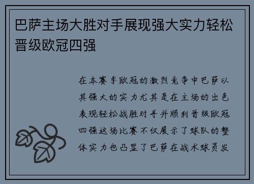 在本赛季欧冠的激烈竞争中,巴萨以其强大的实力,尤其是在主场的出色表现,轻松战胜对手并顺利晋级欧冠四强。这场比赛不仅展示了球队的整体实力,也凸显了巴萨在战术、球员发挥、主场优势以及精神面貌方面的完美结合。本文将从四个方面详细探讨巴萨如何凭借这...